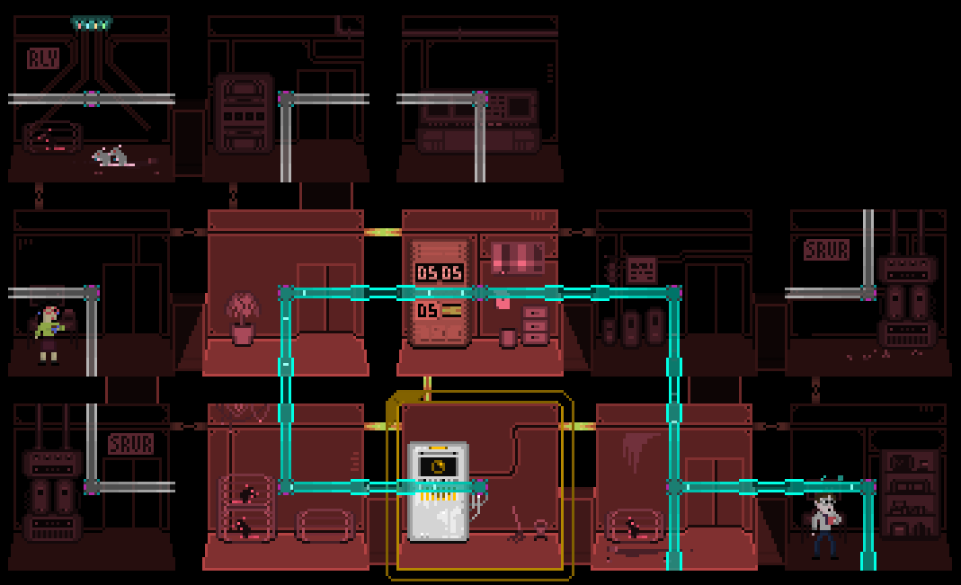 The gameplay of BIT RAT Singularity consists of something pipedream-esque, in which the player tries to rotate pipes in square cells, connecting a source to an exit. Two additional mechanics complicate things: you can only rotate a pipe connected to the source (often being careful not to disconnect it) and only a cell connected to power can have its pipe rotated.